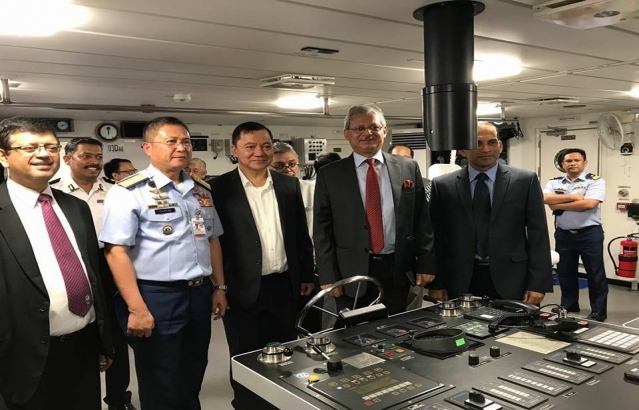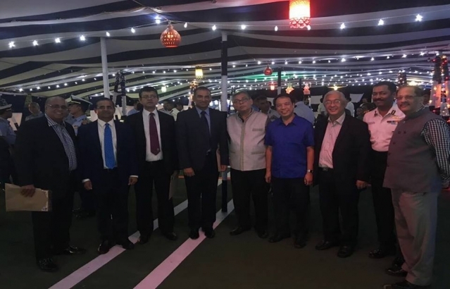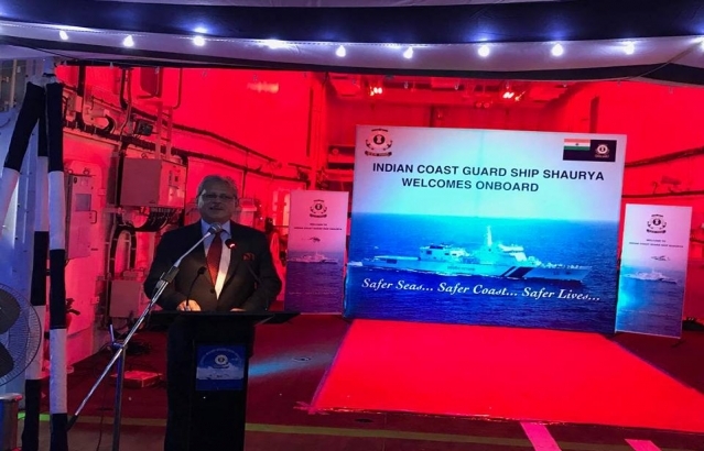Ambassador Jaideep Mazumdar addressing a gathering of Ambassadors, Coast Guard officers of both India and the Philippines and Indian community members during an onboard reception on 1 December 2017.
