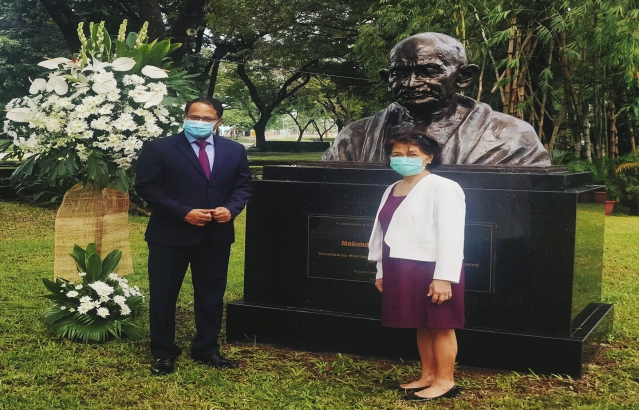 Ambassador Shambhu S. Kumaran and President of Miriam College paid tributes at the bust of Mahatma Gandhi; 2 October 2020