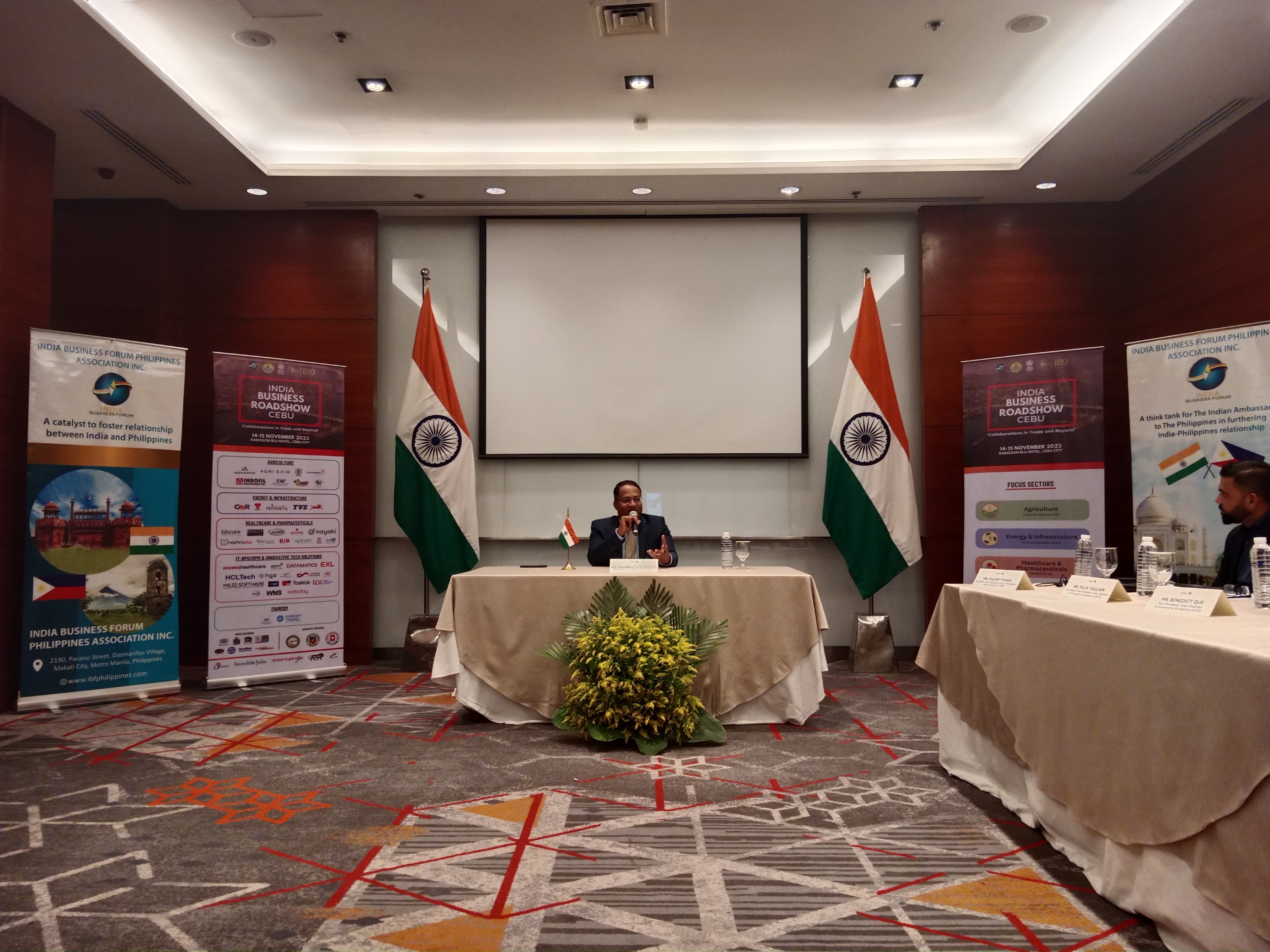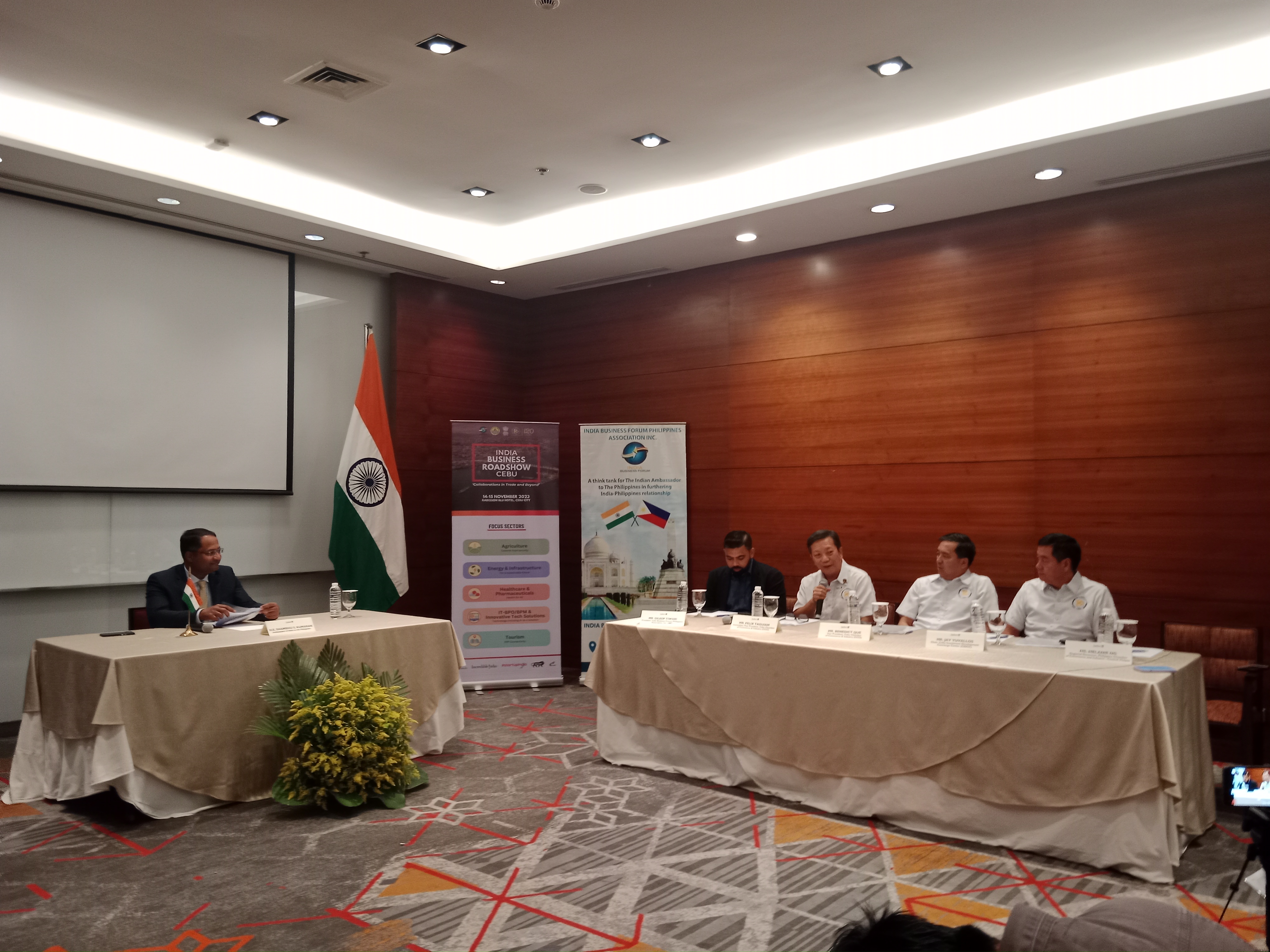 Press Conference of H.E. Shambhu S. Kumaran, Ambassador of India to the Philippines, with (from left to right) President Dileep Tiwari of the India Business Forum Philippines Association Inc., Immediate Past President Felix Taguiam, Vice President Benedict Que, and Chair Jay Yuvallos of the Cebu Chamber of Commerce & Industry on 14 November 2023.