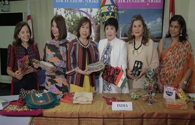 Spouse of Ambassador of India to the Philippines Mrs. Parvati C. Mazumdar with Spouse of Secretary of Foreign Affairs and IBF Chairperson Mrs. Maria Lourdes Locsin, SHOM President Susan Fries, IBF President Helen Ong and others at the India booth during the Press Conference ahead of International Bazaar 2019.