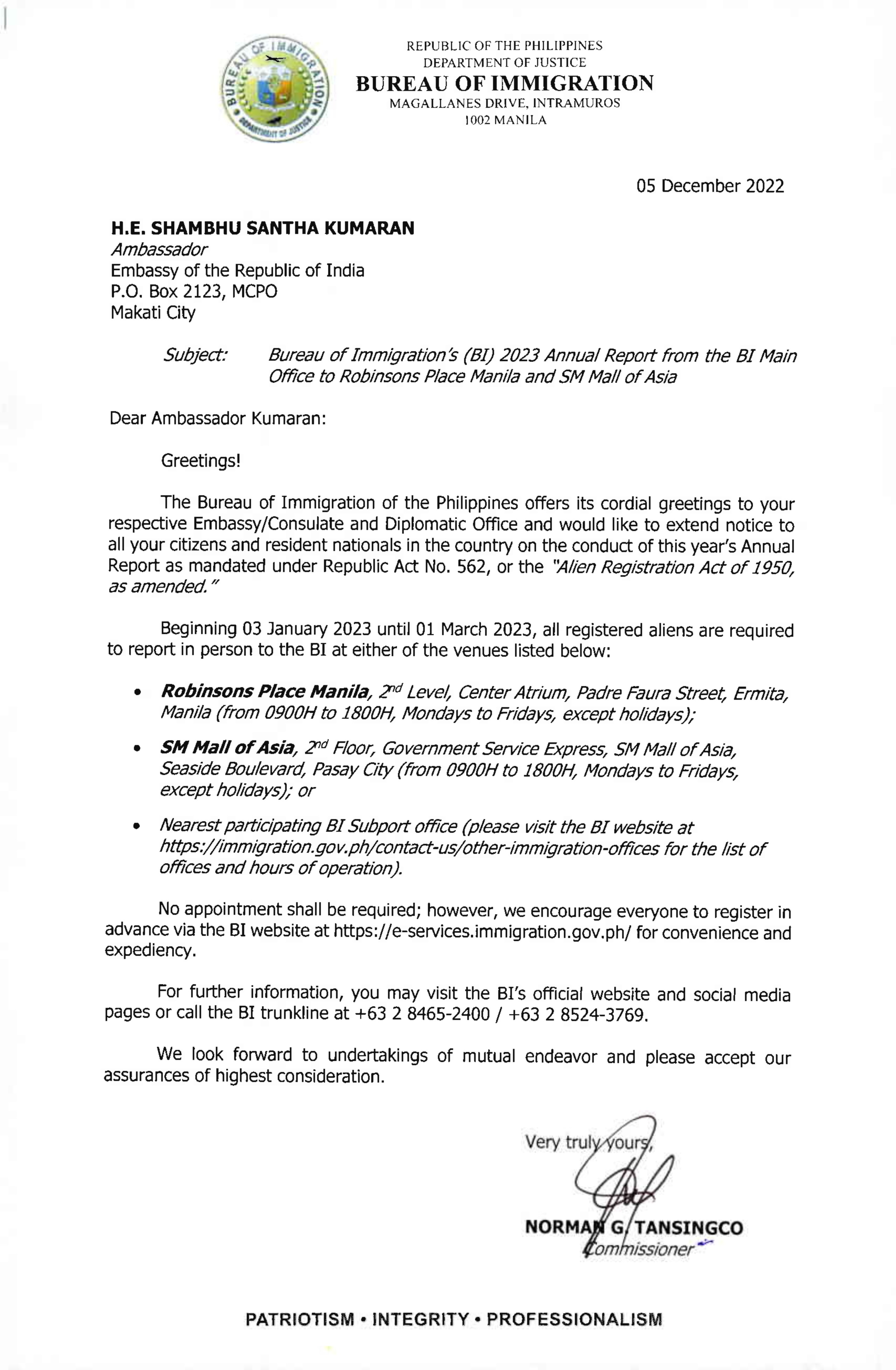 The Embassy has received an advisory from the Bureau of Immigration regarding conduct of 2023 Annual Report, beginning 03 January 2023 until 01 March 2023. All Indian nationals may kindly take note of the advisory. For details kindly check the attachment.