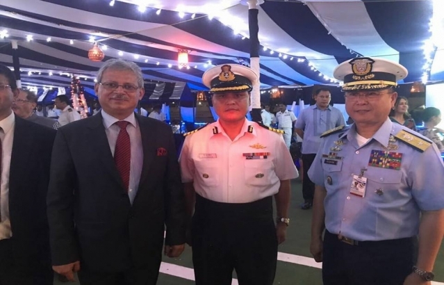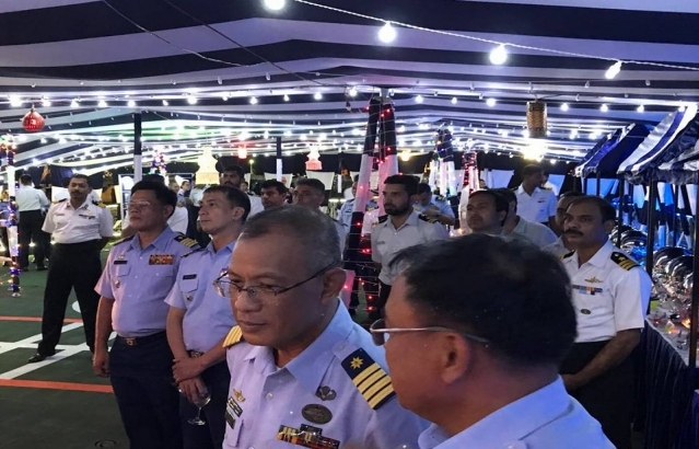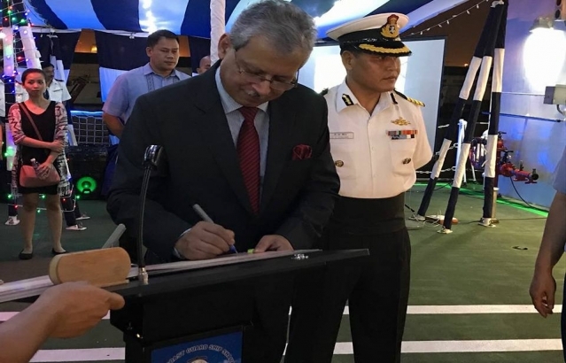 Ambassador Jaideep Mazumdar addressing a gathering of Ambassadors, Coast Guard officers of both India and the Philippines and Indian community members during an onboard reception on 1 December 2017.