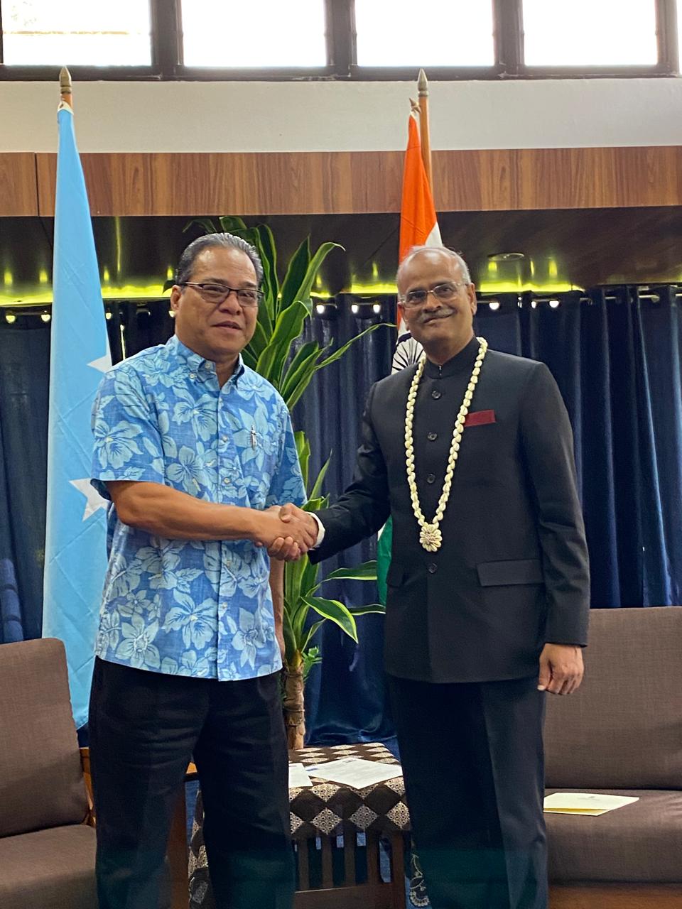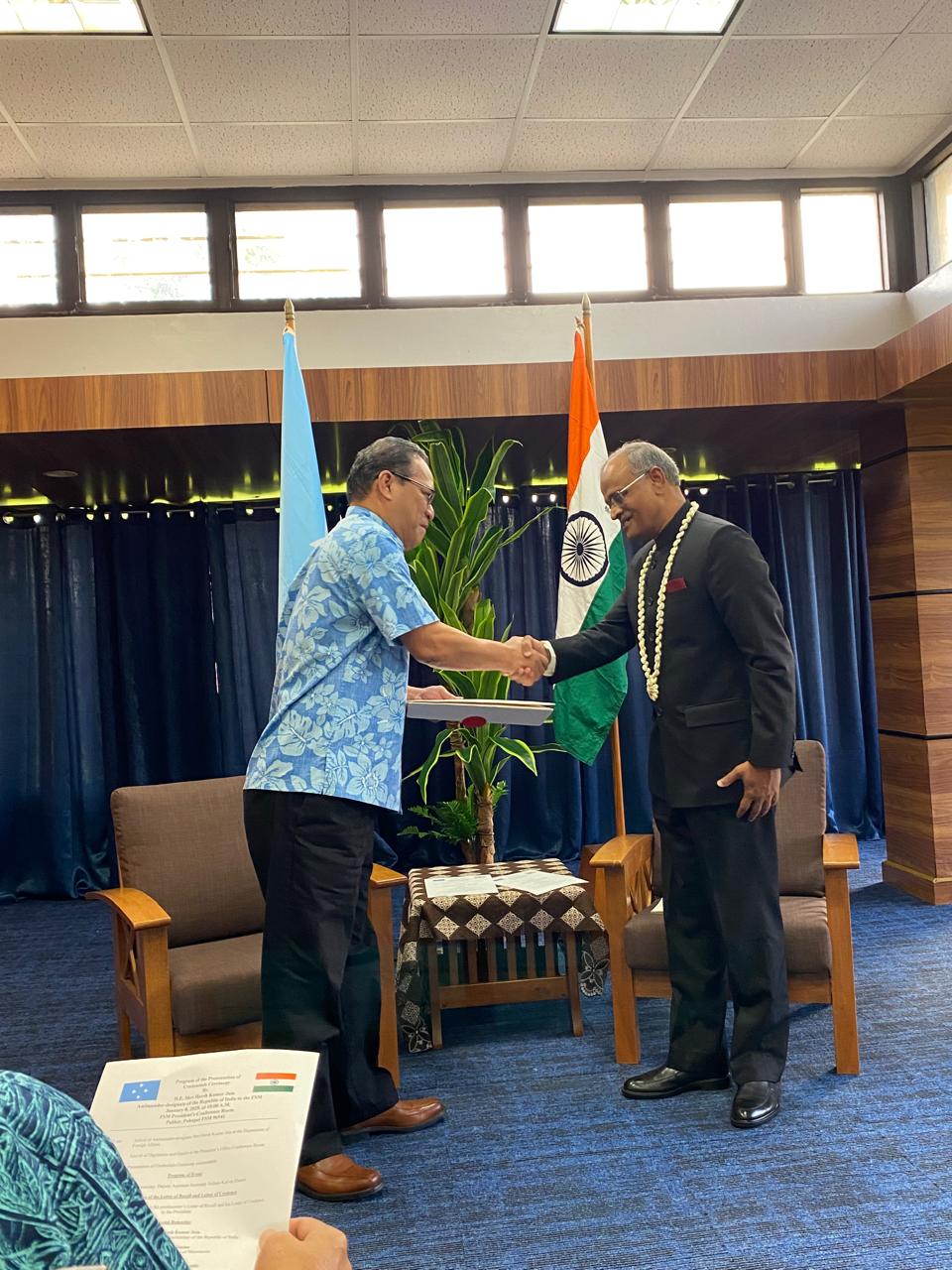 Ambassador Shri Harsh Kumar Jain presented his credentials to H.E. Mr. Wesley Simina, President of the Federated States of Micronesia on 08 January 2025, accrediting him as the Ambassador Extraordinary and Plenipotentiary of India to the Federated States of Micronesia (FSM), with residence in Manila