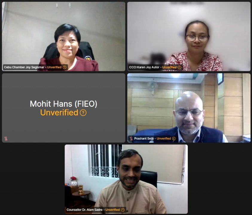 Head of the E&C Wing Counsellor Dr. Sadre Alam convened a virtual meeting between the Federation of Indian Export Organizations (FIEO) (led by Mr. Prashant Seth, Jt. DDG) and the Cebu Chamber of Commerce and Industry (CCCI) (led by Ms. Joy Segismar, Executive Director) to explore opportunities for mutually beneficial collaboration in the Agri-Food Sector (Virtual, 18 November 2024)