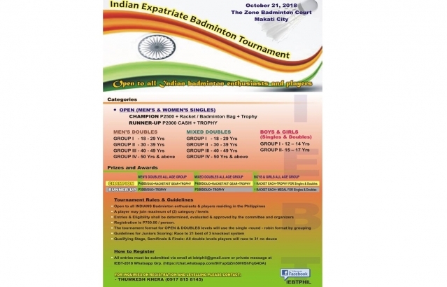 IEBT Philippines invites you to join the 2018 Indian Expatriate Badminton Tournament this coming October 21, 2018 at the Zone Badminton Court, Makati City. This tournament is open to all INDIAN badminton enthusiasts and players. For inquiries regarding the registration and levelling, please contact Mr. Thumesh Khera (09178158145).
