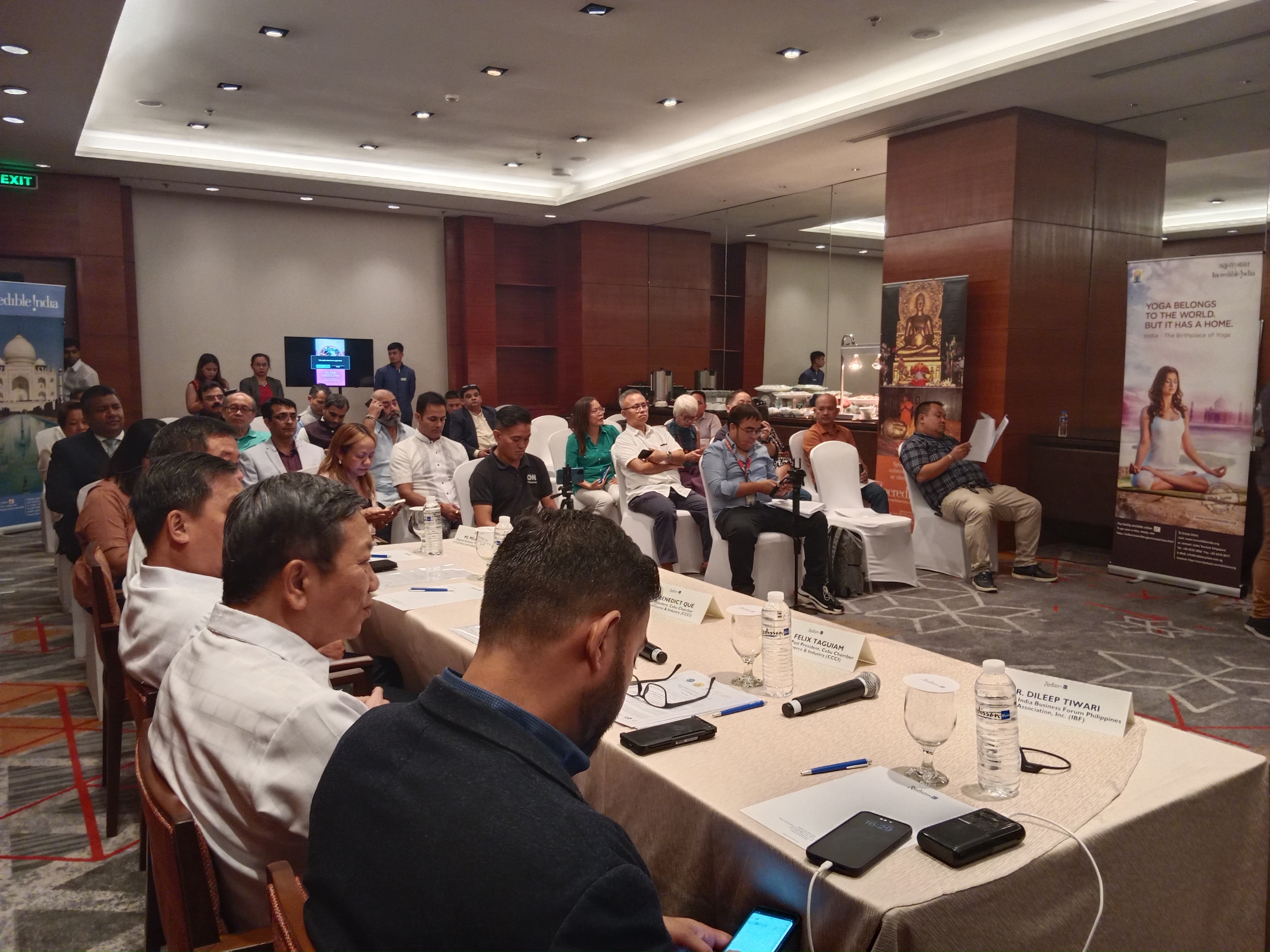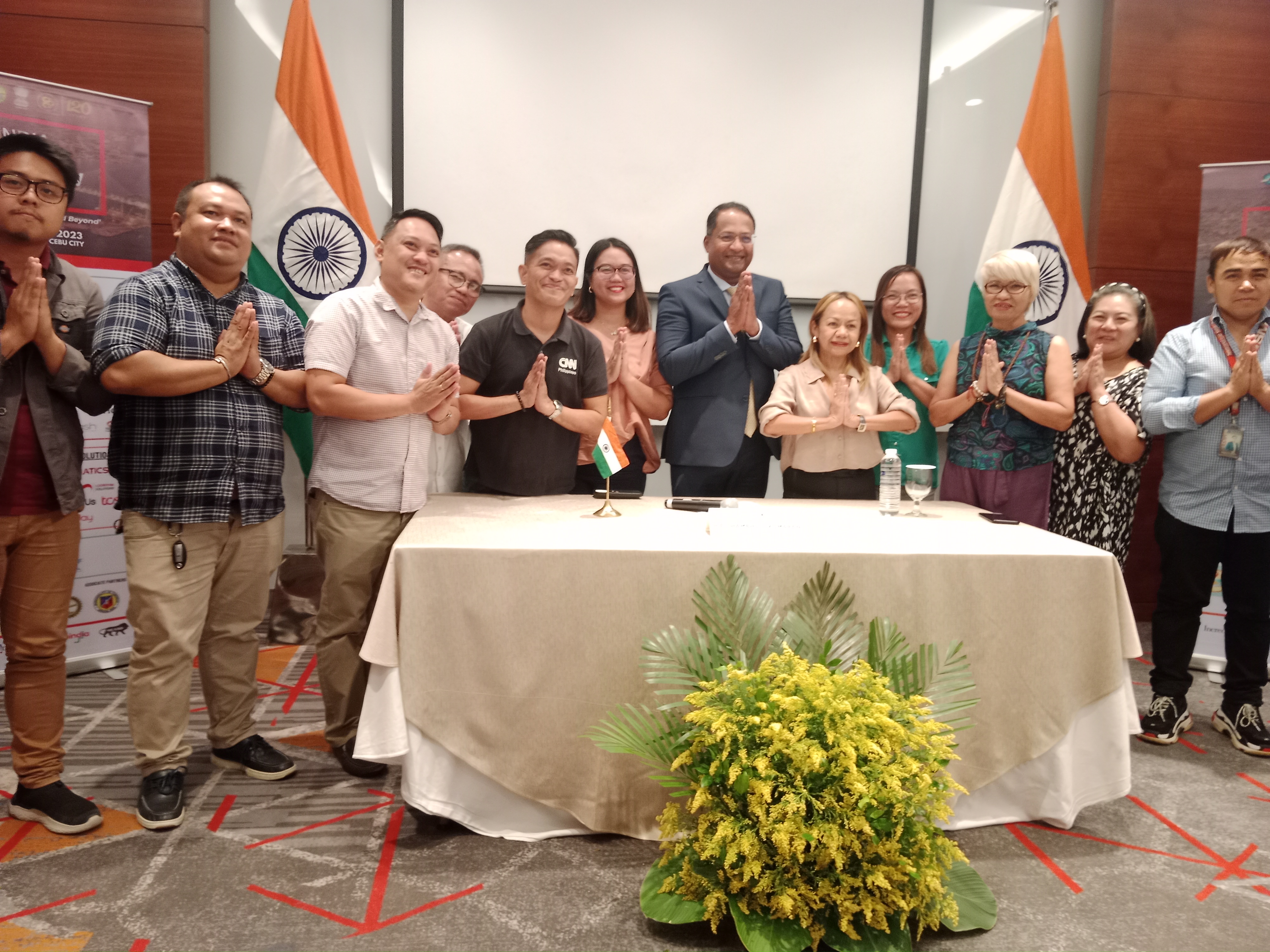 Press Conference of H.E. Shambhu S. Kumaran, Ambassador of India to the Philippines, with (from left to right) President Dileep Tiwari of the India Business Forum Philippines Association Inc., Immediate Past President Felix Taguiam, Vice President Benedict Que, and Chair Jay Yuvallos of the Cebu Chamber of Commerce & Industry on 14 November 2023.