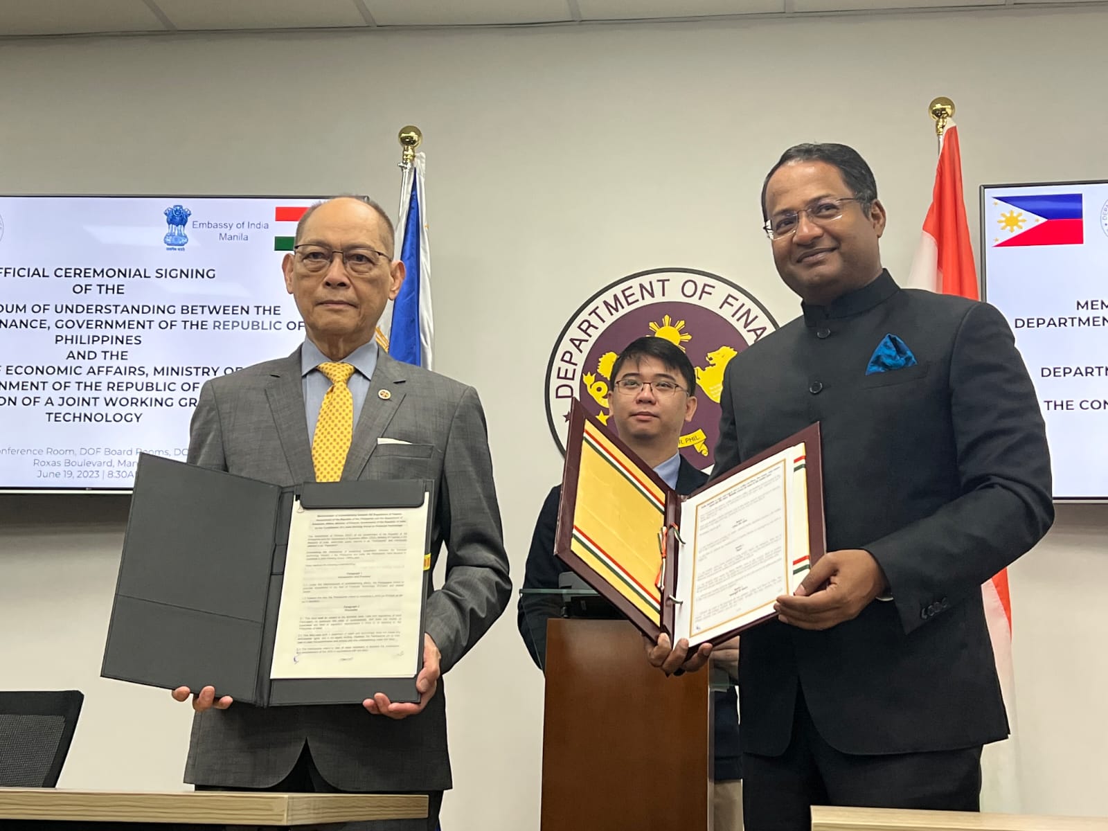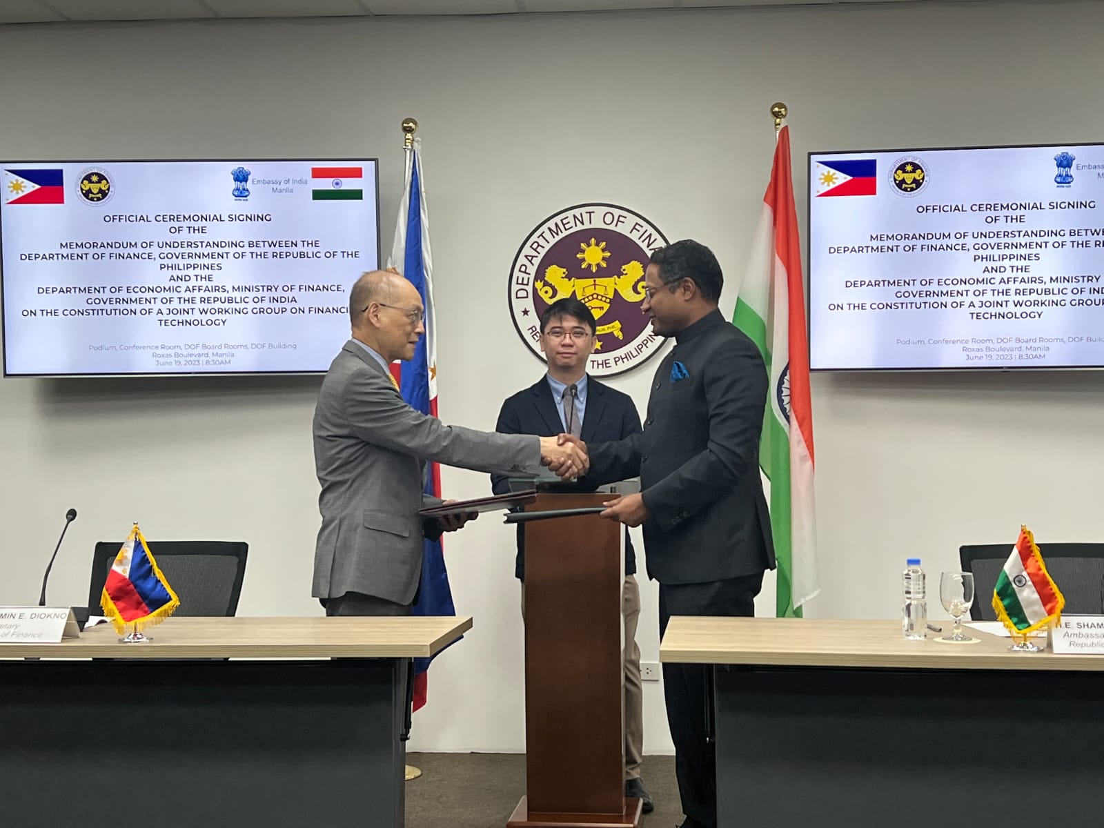 Signing of MOU on Financial Technology Cooperation by H.E. Shambhu S. Kumaran, Ambassador of India to the Philippines, and Secretary Benjamin E. Diokno, Philippines Department of Finance