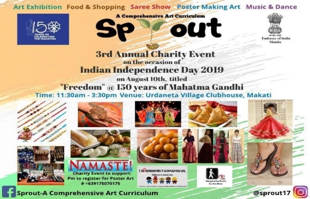 The Embassy of India, Manila collaborates with Sprout to commemorate 150 Years of Mahatma Gandhi and invites you to join the event, "Freedom" @ 150 Years of Mahatma Gandhi" on 10 August 2019, 11:30 am to 3:30 pm at the Urdaneta Village Clubhouse, Makati.