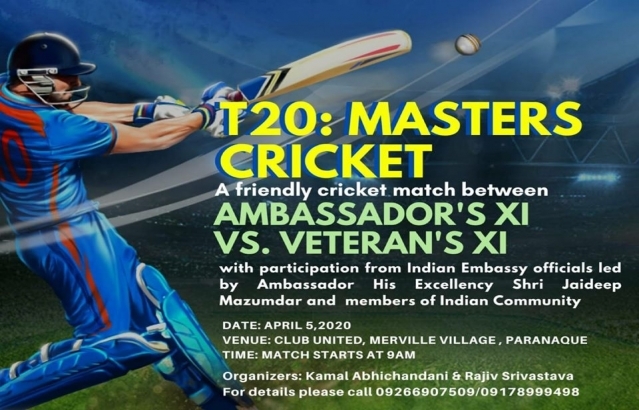 Join us for a friendly cricket match between Ambassador's XI and Veteran's XI on 5 April 2020 at Club United, Merville Village, Parañaque with participation from Embassy of India, Manila Officials led by Ambassador Jaideep Mazumdar and members of the Indian community in the Philippines.