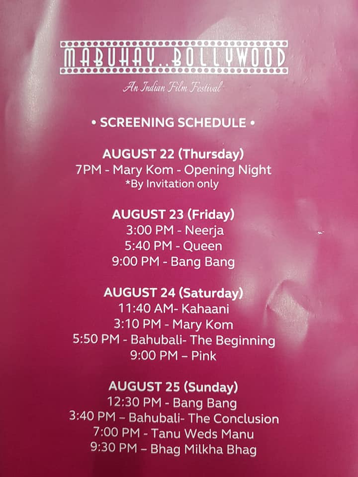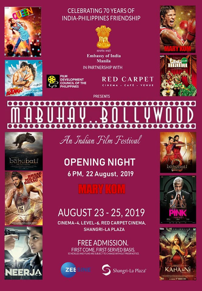 The Embassy of India, Manila in collaboration with the Film Development Council of the Philippines, and Red Carpet Cinema, Shangri-La Plaza will be organizing "Mabuhay Bollywood", an Indian Film Festival from 23 to 25 August 2019 at Cinema 4, Red Carpet, Shangri-La Plaza with free admission. For further details, kindly email us on pic1.manila@mea.gov.in or call us at 843-0101 local 515.