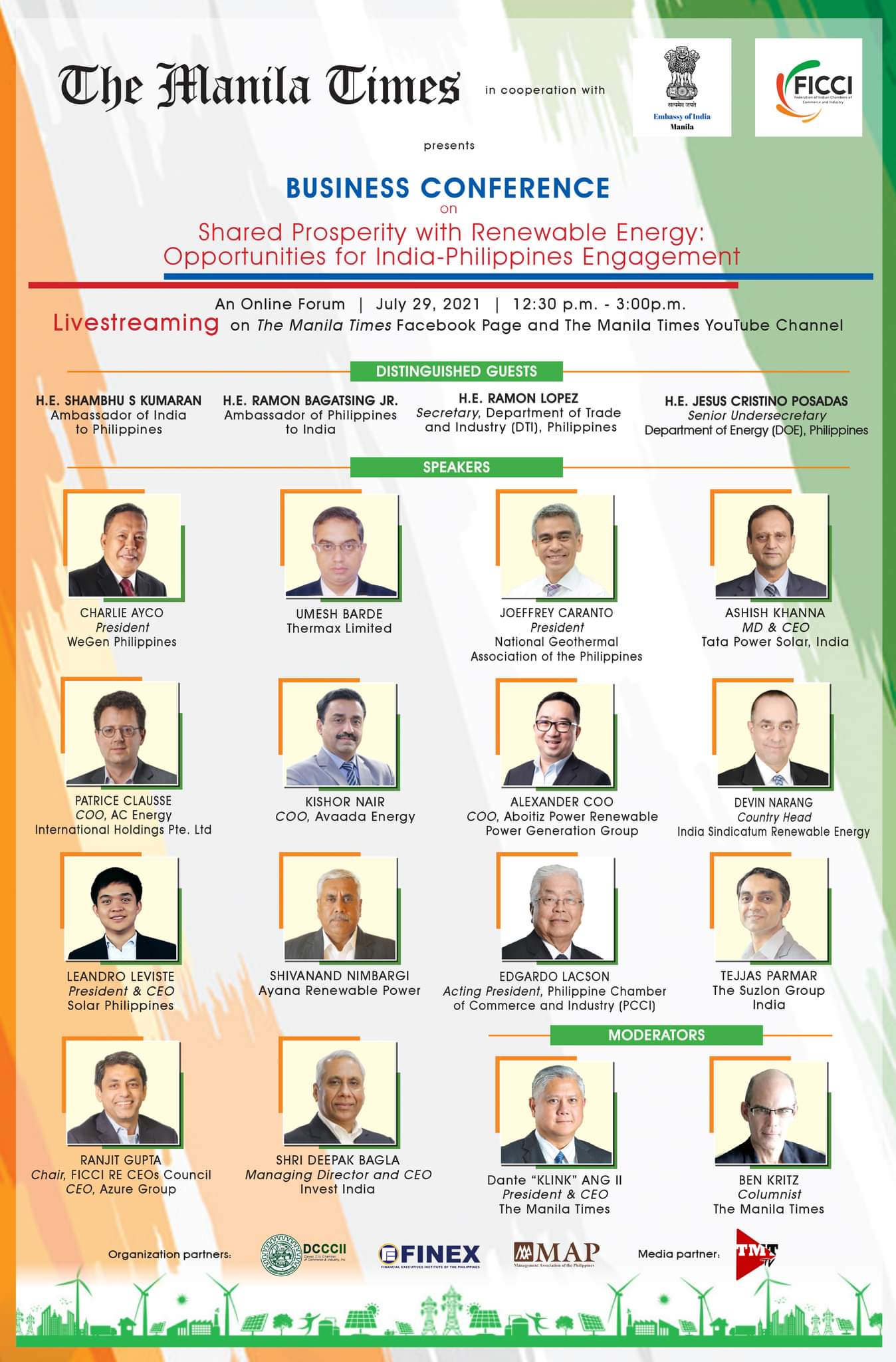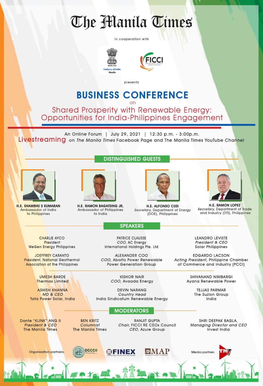 The Embassy of India, Manila in coordination with the Federation of Indian Chambers of Commerce and Industry (FICCI) and the Manila Times  is organizing a business conference on cooperation in the renewable energy sector between India and Philippines on 29 July 2021 from (12:30 PM-3:00 PM).  The conference will be live on the facebook page of the Manila Times.